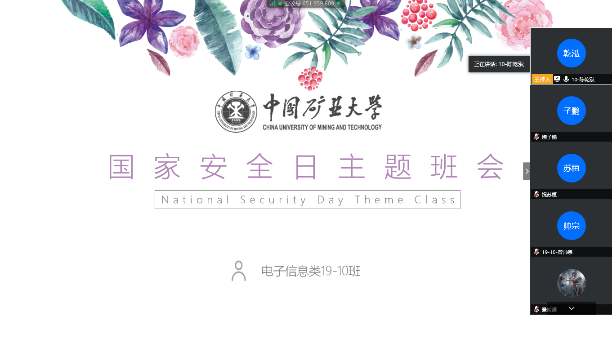 为进一步增强同学们的国家安全意识,提高防范和抵御风险的能力,2020年4月14日,bat365中文官方网站电子信息类19-10班召开“415国家安全日”线上主题班会。班长陈乾泓主持会议,,班级全体同学参会。