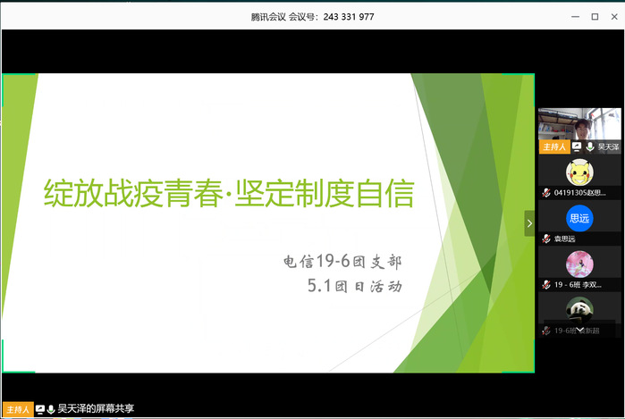 为了激励和引领同学们进一步坚定制度自信,贯彻落实习近平总书记关于疫情防控工作的系列讲话精神,bat365中文官方网站电子信息类19-6班团支部于51日开展绽放战疫青春·坚定制度自信线上主题团日活动。会议由团支书吴天泽同学主持,班级全体同学参加了会议。