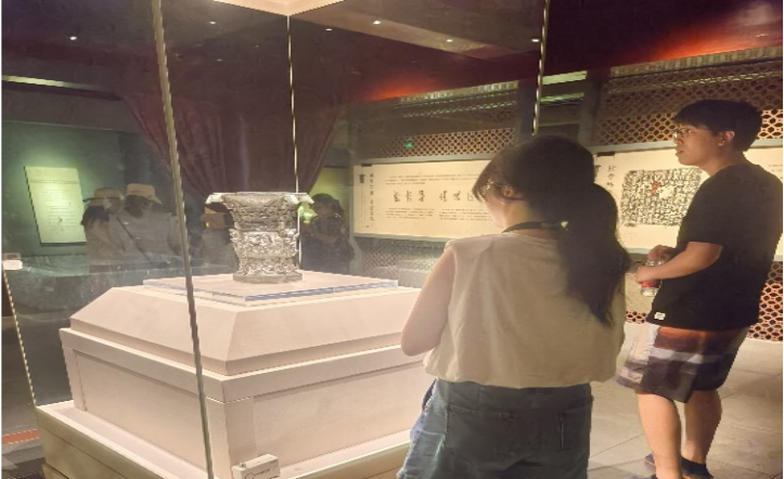 实践团成员们先后参观了商代的青铜鼎、秦代的青铜剑、汉代的青铜镜等珍贵文物。此外,博物馆展示了一些珍贵的青铜器修复工艺品,让参观者们更加了解青铜器的制作过程和保护方法。博物馆还设有临时展览厅,不定期举办各类艺术展览和文化活动,不仅丰富了游客的参观体验,还促进了艺术文化的交流与传承。