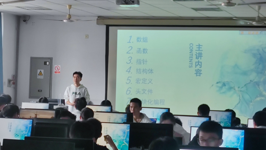 董嘉乐为新成员们讲解了C语言的基础知识和应用,以实例引导成员们理解C语言的基本操作,如变量、函数和循环等,让成员们在实践中学习和理解C语言。他鼓励大家,对于电子设计,既要充满热情、保持毅力,又要坚持正确的方法,掌握专业的理论知识,才能在大赛的道路上走得更远。新成员们踊跃参与到课程学习中,敢于尝试,勇于发问,表现出了极高的热情和积极性。
