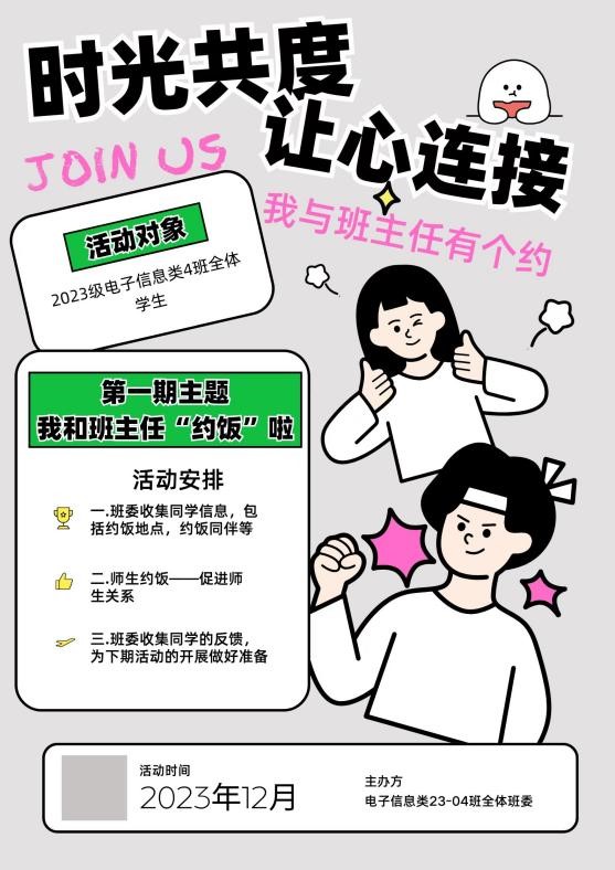 为推动构建和谐师生关系,拉近班主任老师与同学之间的距离,12月9日,电子信息类2023-04班开展“时光共度,让心连接——我与班主任有个约”系列活动第一期。