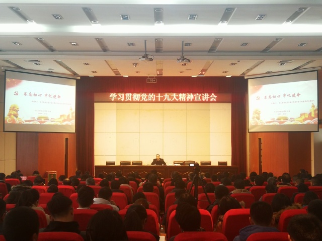 1月15日下午2:00公司党委在A101报告厅举行主题为《不忘初心、牢记使命 落实立德树人 培养德智体美全面发展的社会主义建设者和接班人》党的十九大精神宣讲会,宣讲会由公司党委书记吴瑜主讲,bat365中文官方网站全体教职工、员工党员以及部分员工干部共300余人参加了本次宣讲会。
