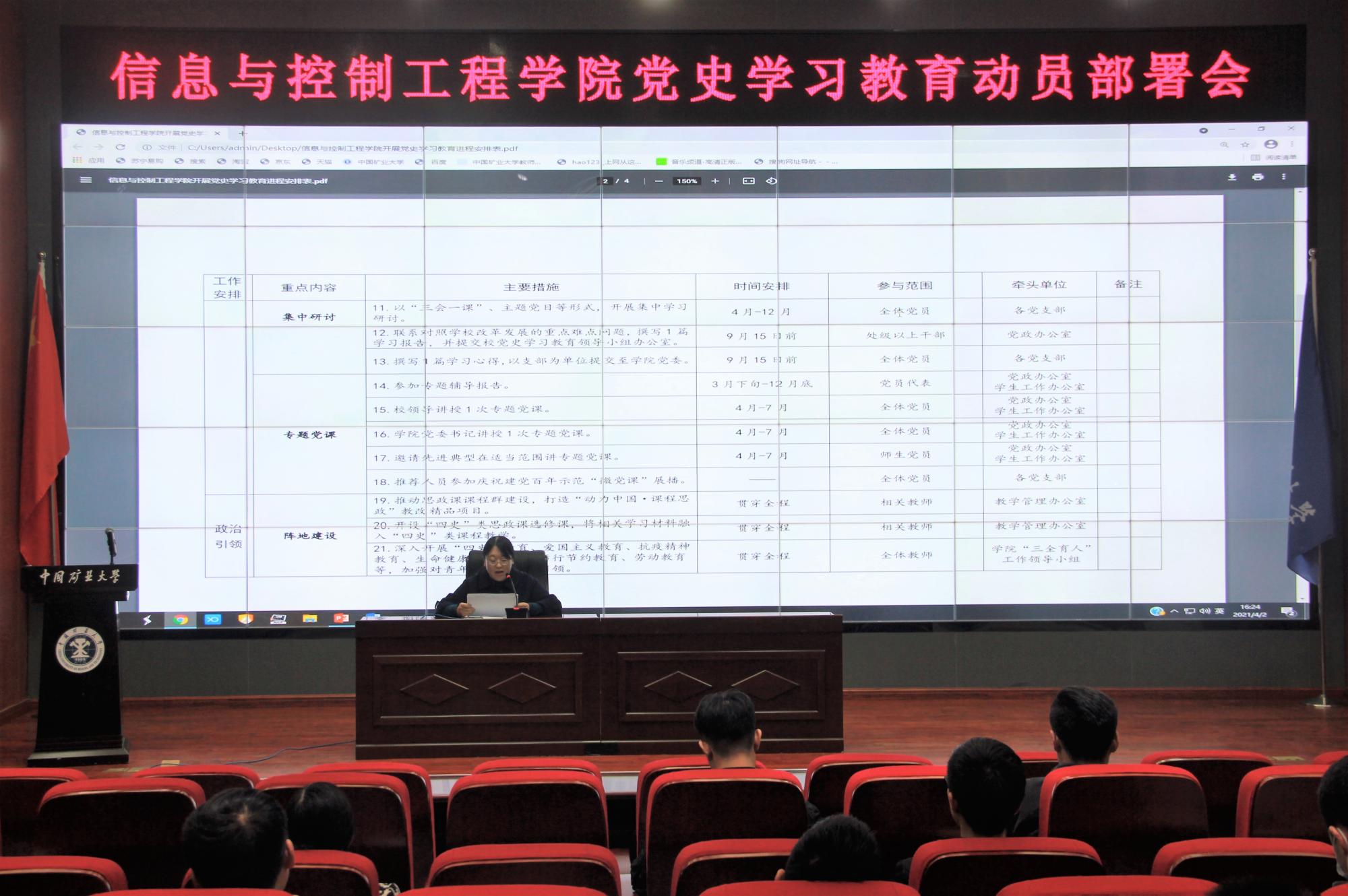 公司党委副书记翟文艳结合工作实际对学院开展党史学习教育的进程安排、具体要求进行了详细说明,并从“深刻认识开展党史学习教育的重大意义”、“突出学做结合,坚持学思用相贯通,知信行相统一”和“做好工作规划、记录和备案”三个方面作了工作提醒和强调。