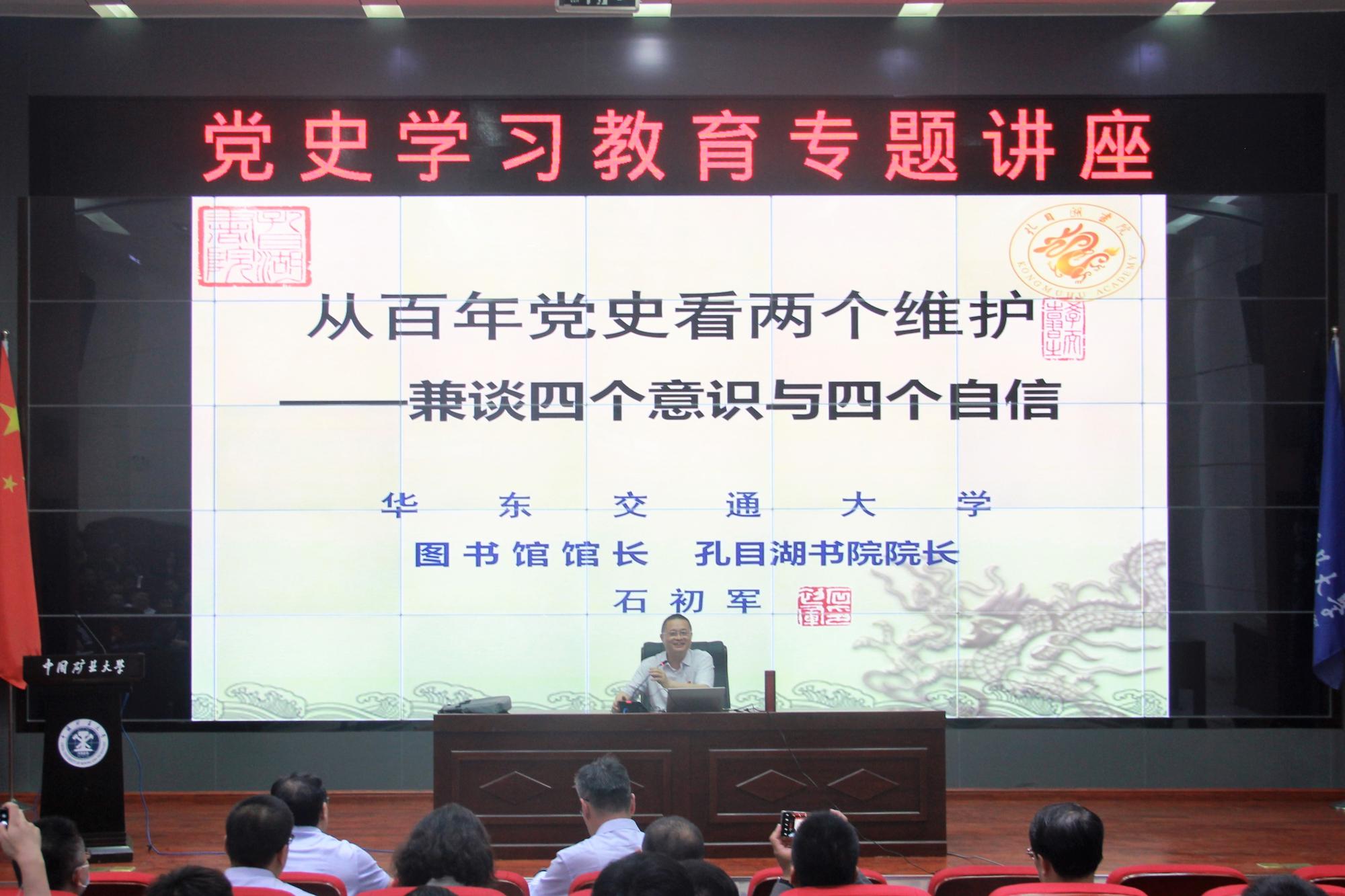 5月13日下午,bat365中文官方网站、矿业学院、中国联通徐州分公司在bat365中文官方网站报告厅举办党史学习教育专题讲座。华东交通大学图书馆馆长、孔目湖书院经理石初军应邀作专题报告。公司师生党员代表聆听了讲座。