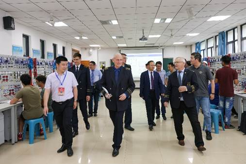 程德强书记介绍了学院人才培养及实验室相关情况。代表团一行参访了公司先进自动化技术实验室、电工机组实验室等,了解了学院与“西门子公司”联合共建综合自动化实验室和培训基地的先进实验仪器、创新实验课程开设等情况,询问技术人员自主研发仪器设备及服务全校量大面广的工科非电类专业电工学实验情况,还与正在实验的国际员工和指导教师等进行交流。