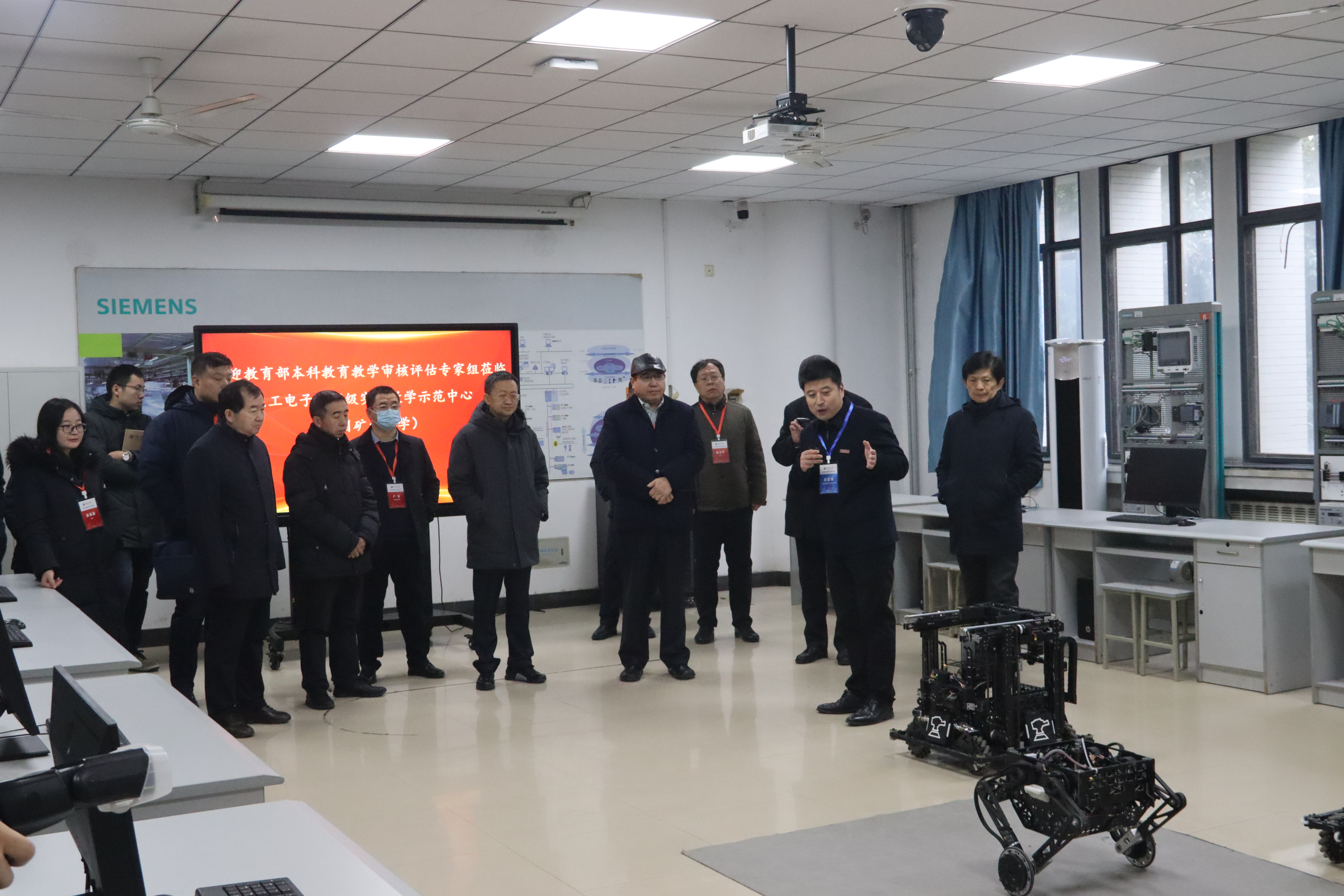 程德强向专家组介绍了示范中心的发展历程、“三融”建设模式、团队队伍及课程资源情况,以及依托示范中心场所、设备及教学优势,面向全校选拔优秀学子组建bat365在线平台官方网站CUBOT战队、自主研发多种机器人和近年来获得省级及以上竞赛获奖等情况。专家组重点考察了学院与西门子联合共建实验室,了解校企合作实验项目开发、校企协同育人等工作,并就专业实验条件建设与人才培养等工作进行了交流。