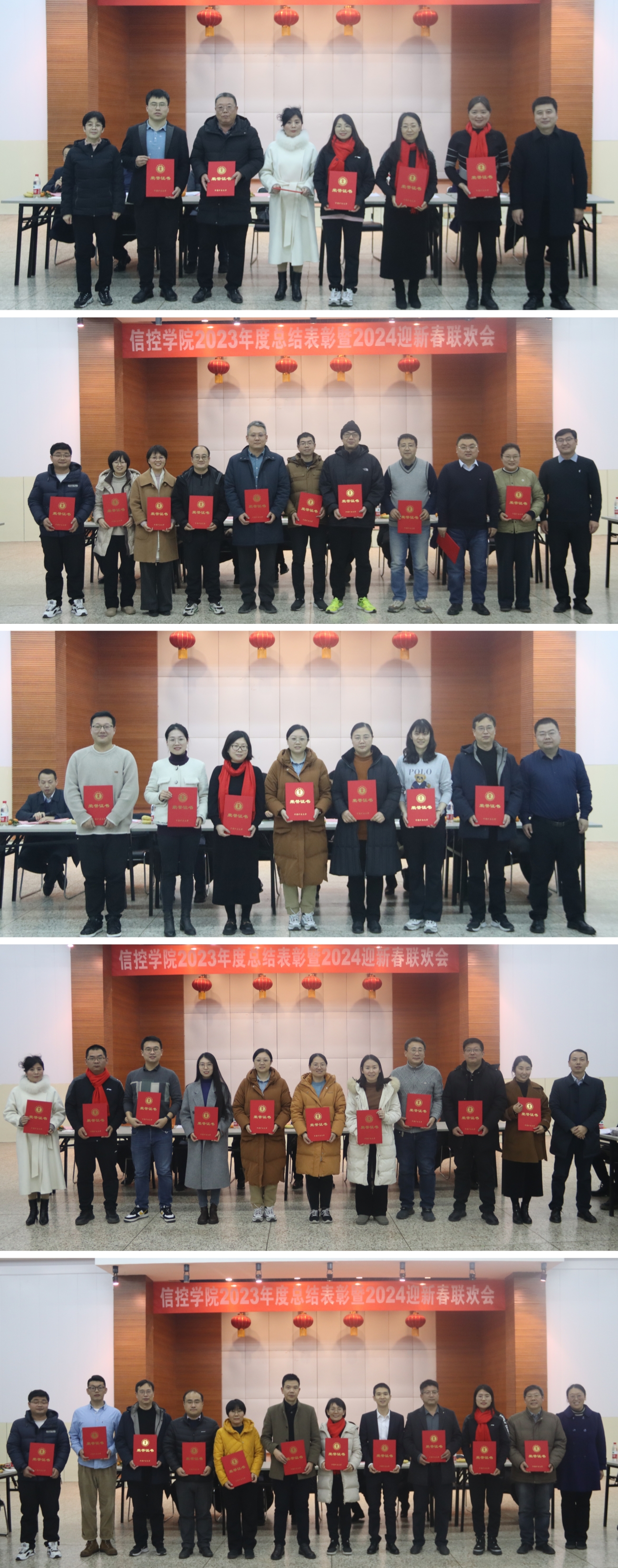第一阶段举行总结表彰会,会议由陈平主持。王雪松发表致辞讲话,她通报了一年来学院在学科与平台建设、团队队伍与人才引培、科学研究与公司产品、员工工作与人才培养、管理服务与实验室建设等方面的工作成绩,对2024年持续推进学院工作进行了展望,向全体教职工表示诚挚感谢并送上新年祝福。程德强宣读《学院2023年度荣誉称号表彰决定》《学院2023年度院级优秀班主任表彰决定》。学院领导分别为获得安全工作先进个人,团队建设、科研工作与研究生公司产品先进个人,公司产品先进个人,人才招聘、学科竞赛与学风建设先进个人,管理服务先进个人的46名教职工和院级优秀班主任的10名老师颁发荣誉证书。