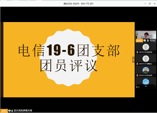 为了进一步规范基层团支部工作,切实加强团员思想教育,增强团组织的战斗力、凝聚力,并号召同学们交流疫情期间假期实践活动内容及心得,2020年3月22日,bat365中文官方网站电子信息类19-06班团委开展以“团员评议及寒假社会实践交流”为主题的班会。本次班会由团支书吴天泽同学通过腾讯会议线上主持,班级全体同学参加了班会。