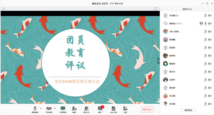 为了增强团员之间的团员意识与组织意识,加强基层团组织建设,进一步学习习近平新时代中国特色社会主义重要思想、党的十九大精神以及习近平总书记在疫情防控期间的重要指示思想,3月22日,bat365中文官方网站电子信息类19-3班团支部在腾讯会议平台举行了团员教育评议班会。本次班会由团支书韩保闯主持,3班全体同学参加。