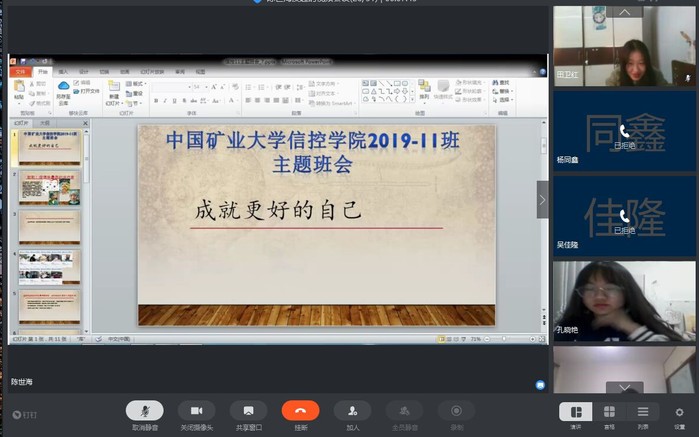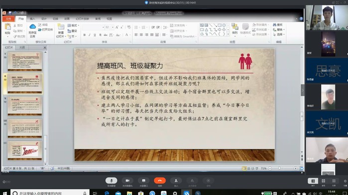 为了了解每位员工疫情期间居家的具体情况,并积极落实防疫的宣传工作。3月9日晚上7点,bat365中文官方网站19-11班举行了“成就更好的自己”线上主题班会,本次班会由班主任陈世海组织,并且邀请了bat365中文官方网站19级辅导员李鸣轩出席,11班全体员工参加了本次会议。