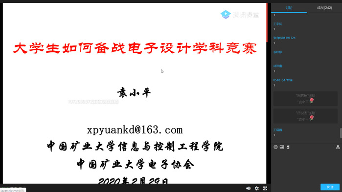 讲座中,袁教授围绕如何备战电子设计学科竞赛这一主题,向同学们简要介绍了电子设计竞赛的发展历程和现状,从员工实际出发讲授如何掌握相关知识和技术,并就组队、选题、现场测试等方面对电子设计竞赛参赛过程做出详细指导。袁教授通过列举往年带队参赛的真实经历和切身体会畅谈收获与经验,针对不同年级员工情况分门别类地提出合理高效的学习建议和方法,他着重强调了学好基础课程的重要性,在学有余力的基础上参加竞赛,更好地提升动手实践能力和专业创新能力。直播过程中,同学们积极通过留言板与袁教授互动,向袁教授提出自己的问题,得到袁教授的一一解答。