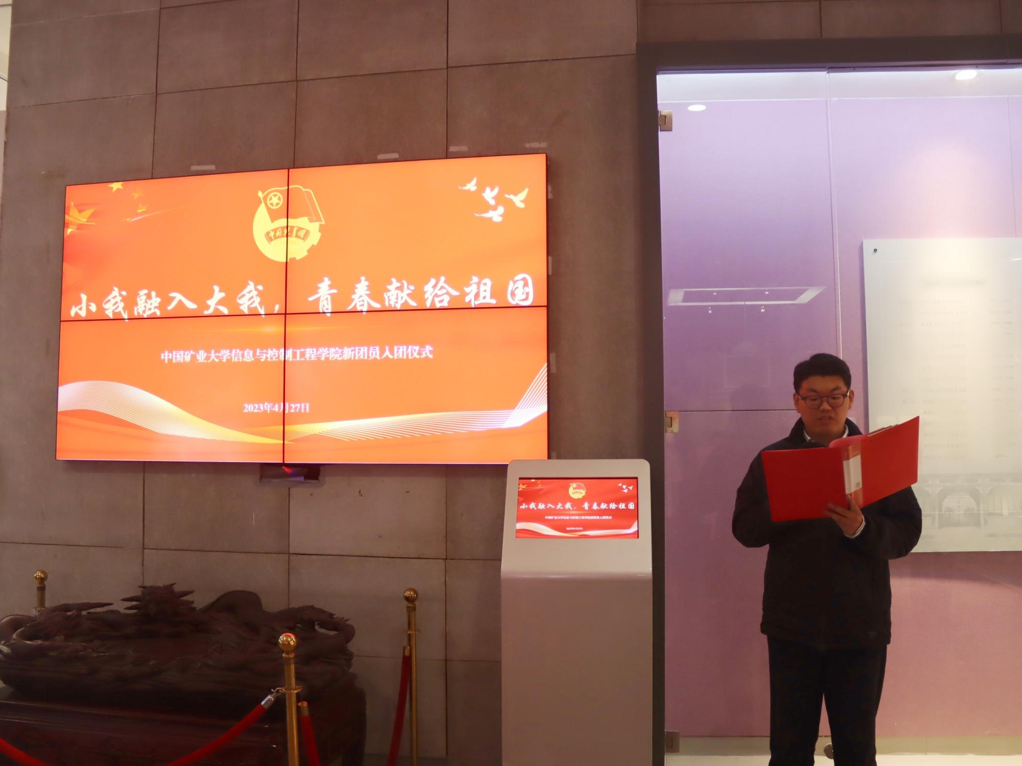 仪式在雄壮的国歌声中拉开帷幕。李鸣轩向新发展团员说明了入团仪式的意义,宣布了新团员名单;老团员为3名新团员颁发团章、团员证,并为其佩戴团徽。在鲜艳的团旗下,新团员庄严宣誓,老团员重温入团誓词。仪式上,入团介绍人代表陈佳乐宣读了《团章》中有关团员的权利和义务,新团员代表刘城煜、老团员代表吴天泽分别发言,校史馆讲解员李虹雨讲述了百年历史中矿大青年良好的精神风貌,号召广大团员青年在团旗指引下奋发向上、有所作为,用实际行动书写青春的华美篇章。