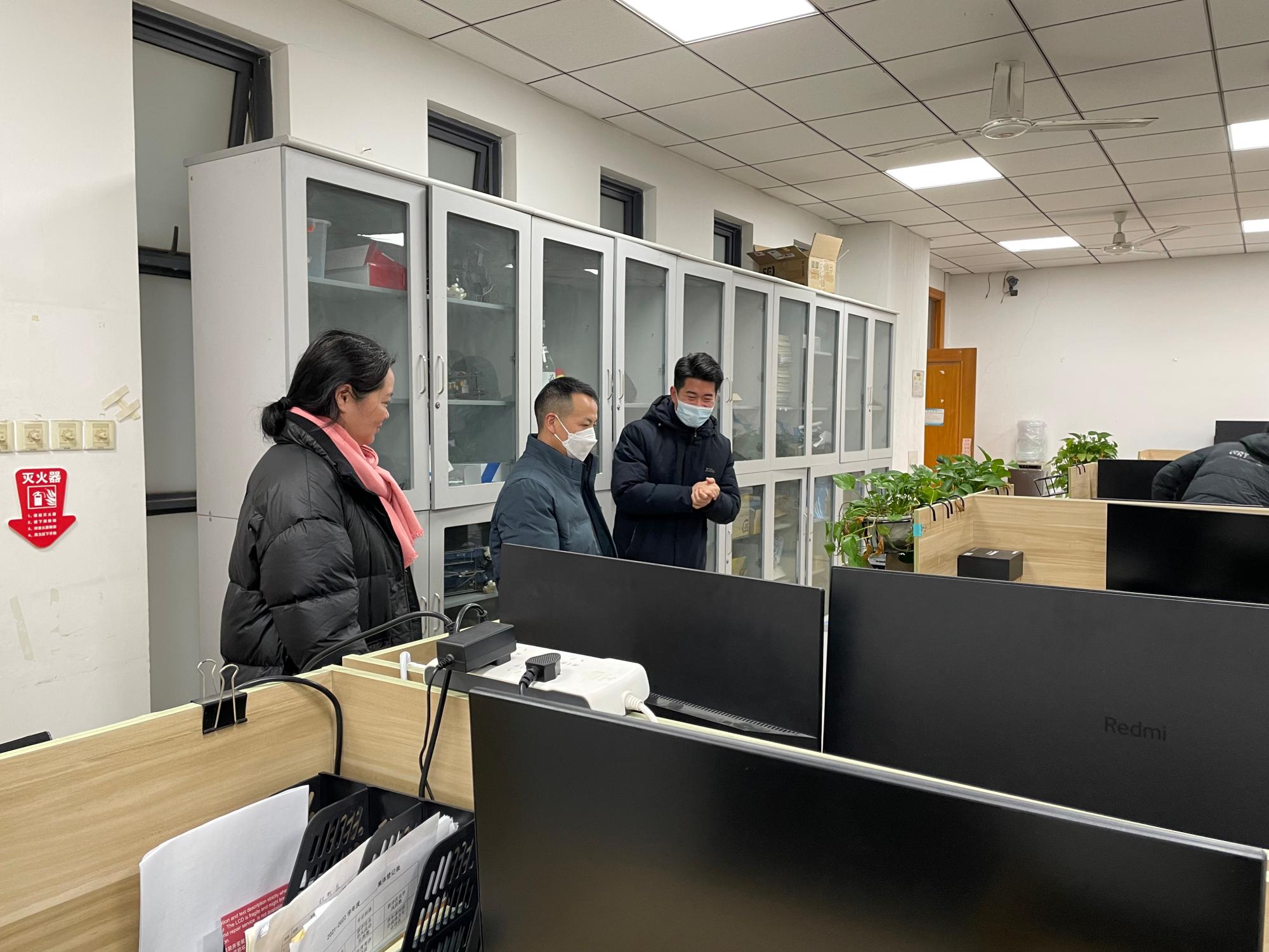 1月6日下午,副经理陈平与办公室、实验中心相关人员,对学院办公室、实验室和师生工作室等开展安全检查。他对办公室人员关好门窗、关闭电源等进行了提醒,询问了员工实验进展和离校安排等情况,并对做好实验室人员进出登记、环境卫生和用电安全等提出了要求,并查看了假期关闭实验室封条张贴等情况。